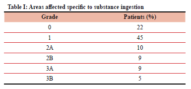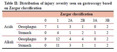 Fifty-one patients underwent flexible upper endoscopy as they presented within 72 hours of whom five had CT scans as they had higher grade injuries based on the Zargar classification on flexible endoscopy. Table I demonstrates the distribution of injury identified on flexible upper endoscopy based on the Zargar classification. A CT grading system was employed to estimate injury severity in those patients who underwent a CT scan.13 Sixteen water-soluble contrast studies were done for patients who presented after 72 hours. Table II depicts the distribution of injury, the substance ingested and findings on gastroscopy as per the Zargar classification grading.