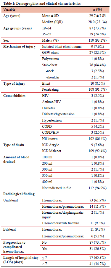 Data collected constituted of 110 (93%) males and eight (7%) females. The average age of each patient was 29.7 ± 7.83 years, with a median age of 28.0 (IQR 23-34) years. The majority (87; 73.7%), of patients were young adults aged 19-34. Stab-chest was the most frequent mechanism of injury (76; 64.4%), followed by gunshot wound (GSW)-chest (27; 22.9%) and isolated blunt chest trauma (9; 7.6%). Other mechanisms of injury were stab-neck (3; 2.5%), stab-shoulder (2; 1.7%) and blunt chest trauma in the context of polytrauma (1; 0.8%). The majority type of injury was penetrating (108; 91.5%), with only 10 (8.5%) cases of blunt injuries. Two broad categories of progression to RH were experienced in six patients with blunt chest trauma (19.4% of total patients with RH) and 25 patients with penetrating injuries (80.6% of total patients with RH) (OR = 4.98, 95% CI 1.3-19.1, p = 0.018). A total of 109 (92.4%) patients had an intercostal chest drain (ICD) Malecot and only nine (7.6%) ICD Argyle, an observation likely due to the hospital's procurement bias for Malecot drains as opposed to PVC drains. The study, however, indicated no statistically significant association between type of drain (Argyle/Malecot) and progression to RH, using a Fisher's exact test, p = 0.240 but the odds of not progressing to RH were lower for ICD Argyle compared to ICD Malecot (OR = 0.41, 95% CI 0.10, 1.64, p = 0.10). Despite the evidence to support this observation being low, we speculate that it is likely due to the malleability of Malecot drains predisposing them to kinking that slows down or halts the drainage of haemothoraces leading to a likely progression to RH. Data on amount of initial blood drained was limited because the majority of patient records (112; 94.9%) did not provide this information; we attribute this finding to poor record keeping. In terms of severity of trauma, radiological findings indicated that most chest injuries were unilateral (100; 84.7%) and only 17 (14.4%) were bilateral. Most of the patients did not progress to RH (87; 73.7%), with only 31 (26.3%) progressing to RH. From the patient cohort, 41 patients experienced a prolonged LOS > 7 days. Out of those patients, six (14.6%) had blunt chest trauma and 35 (85.4%) had penetrating chest injuries. Most patients (77; 65.3%) had LOS < 7 days (Table I). All 31 patients with RH experienced a prolonged LOS in this study, six (19.4%) with blunt chest trauma and 25 (80.6%) with penetrating chest injuries.