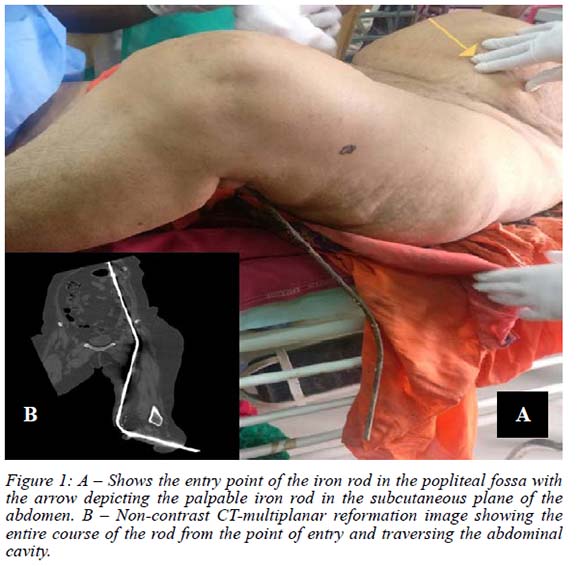On local examination, an iron rod was found entering through the medial aspect of the left popliteal fossa extending into the groin in the subcutaneous plane. The iron rod was palpable per abdomen along the left iliac fossa, left lumbar and until the epigastric region. The tip of the iron rod could be palpated in the left 9th intercostal space.