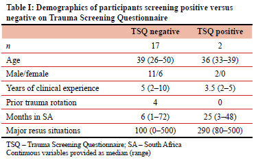 No statistical differences in age, years of prior experience, prior trauma rotation, number of major resuscitations, or length of stay in South Africa were observed in those scoring > 5 compared to < 6 in the TSQ questionnaire (Table I).