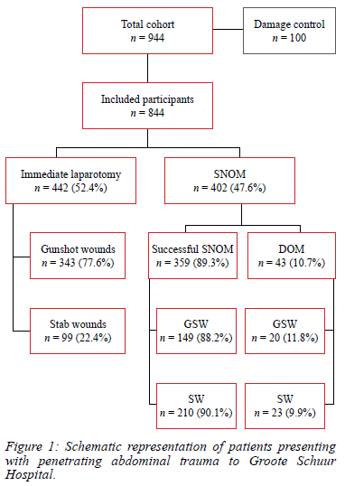 The management of trauma in general and specifically penetrating abdominal trauma (PAT) continues to represent a considerable burden on the local healthcare system. The management of PAT has evolved over the last five decades from routine mandatory laparotomy to selective non-operative management (SNOM). SNOM has been embraced as a safe alternative for stab wounds (SW) to the abdomen since the initial reports by Shaftan and Stein.1-3 More recently, large studies from South Africa by Muckart et al. and Demetriades et al. suggested that using repeated clinical abdominal examination, SNOM can be applied safely to a specific group of patients with gunshot wounds (GSWs) to the abdomen.45 Since then, the SNOM of GSW has gained momentum as an acceptable treatment strategy. Despite accepting SNOM as a routine practice for PAT in highvolume trauma centres, there is a lack of reporting of the outcomes of unsuccessful SNOM. A better understanding of this particular group is required to guide an effective and safe approach for patients with PAT, especially those selected for non-operative management (NOM). This study aims to investigate the outcomes of unsuccessful SNOM, or more appropriately labelled delayed operative management (DOM) with patients undergoing immediate laparotomy.6,7