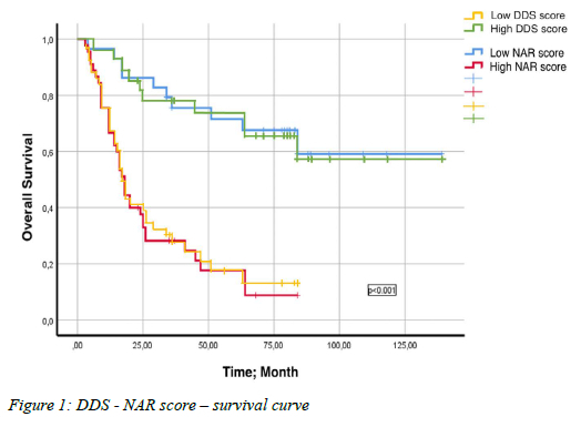 The median overall survival time of patients during the 27.5 months (3-139 months) follow-up period was found to be 29 months (95% CI; 10.9-47.0). Survival analysis based on NAR score and DDS showed that patients with low NAR score and high DDS had significantly longer overall survival (Table IV, Figure 1). In addition, significant survival differences were obtained among variables such as gender, surgical type, vascular invasion, neural invasion, grade, and neoadjuvant chemotherapy type (Table IV). No survival difference was observed based on tumour location (p > 0.05).
