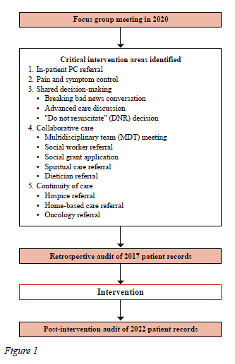 This study was conducted in the Surgical Gastroenterology Unit at Groote Schuur Hospital and the University of Cape Town in Cape Town, South Africa. The flow of the QI process is detailed in Figure 1. A focus group consisting of HPB surgeons, PC personnel, oncologists, nursing staff, and social workers identified five critical intervention areas that should routinely be documented in patient records. These were in-patient PC referral, pain and symptom control, shared decision-making (four measurable variables), interdisciplinary collaborative care (five measurable variables), and continuity of care (three measurable variables), as detailed in Table I. Pain and symptom control addressed pain, jaundice, pruritus, nausea, constipation, vomiting and diarrhoea (Table II). The intervention centred on an active collaboration between HPB surgeons and the PC team, with weekly PC ward rounds including guidance for junior surgeons and participation of the PC team in the weekly MDT meeting.