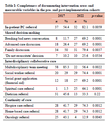 RESULTS: A total of 68 (2017 pre-PC-QI) and 39 (2022 post-PC-QI) patient records were audited. Demography, symptom duration, referral delay, and clinical findings were similar in both cohorts. In-patient PC referrals improved significantly from 54.4% in 2017 to 82.1% in 2022 (p = 0.0059). Significant improvements were also recorded in shared decision-making, collaboration, and continuity of care, while the reassessment of pain and symptoms after treatment improved. Fewer invasive procedures were done in the 2022 cohort (p = 0.0056). The delay from admission to an invasive diagnostic procedure decreased from a mean of 8.7 to 1.5 days (p = 0.0001). The duration of hospital admission, overall survival (OS), and readmissions during the final 30 days of life were similar.