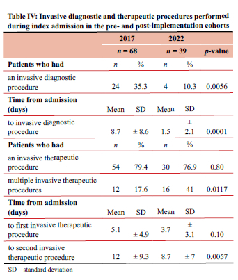 Fewer patients underwent invasive investigative or diagnostic procedures in the 2022 cohort (p = 0.0056), while the delay from the time of admission to invasive diagnostic procedure decreased from a mean of 8.7 to 1.5 days (p = 0.0001) (Table IV). However, 41% of patients underwent multiple invasive interventions in the 2022 cohort compared to 17.6% in 2017 (p = 0.0117).