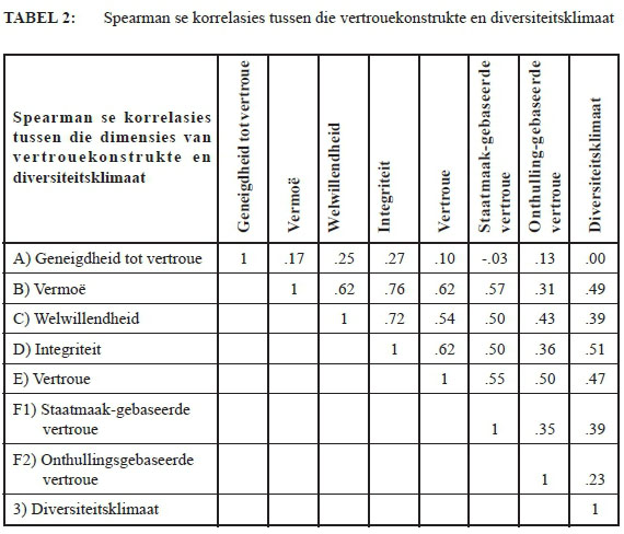 Uit Tabel 2 is dit duidelik dat die meerderheid dimensies binne die vertrouekonstruk, soos mens van n multidimensionele konstruk kan verwag, n verband met mekaar toon.