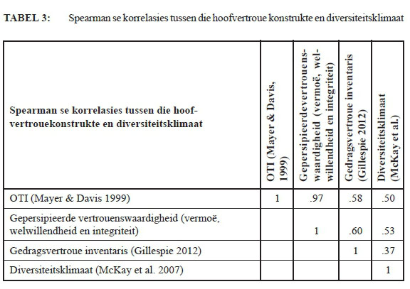 Uit Tabel 3 is dit duidelik dat al die hoofkonstrukte 'n verhouding met diversiteitsklimaat het. Die gepersipieerde vertrouenswaardigheidskonstruk (vermoë, welwillendheid en integriteit) en OTI het die sterkste persepsies van 'n diversiteitsklimaat gemeet op 'n Spearman-korrelasie van onderskeidelik 0.50 en 0.53 en dui dus 'n groot effek aan. H2 word aanvaar.