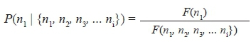 Waar F(n1) die totale aantal gevalle (ongenormaliseerde frekwensie) van die eerste ortografiese variant is, F(n2) van die tweede variant, ensovoorts (Wallis et al. 2012:4). Die waarskynlikheid P word uitgedruk as ʼn waarde tussen 0 (onwaarskynlik) en 1 (volkome waarskynlik). Aangesien daar met waarskynlikhede gewerk word, kan ook met die gemiddeld van waarskynlikhede oor verskillende korpusse heen gewerk word (kyk Van Huyssteen (2016; 2017) vir ʼn toepassing van dié model).