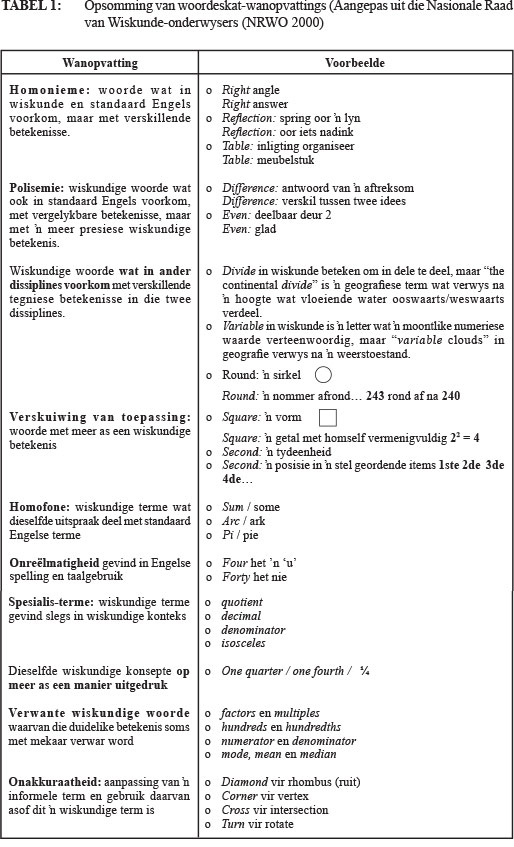 Soos hierbo genoem, is wiskunde nie taal-vry nie en sy spesifieke woordeskat, sintaksis en diskoers skep talle uitdagings vir ETtLs (Barton & Neville-Barton 2003). Selfs leerders wat wiskunde in hul moedertaal leer, ervaar probleme om die wiskunde-register aan te leer, maar die probleem word vererger vir ETtLs wat wiskundekonsepte in ʼn tweede, derde of selfs vierde taal moet aanleer. Engels is ʼn moeilike taal om aan te leer, selfs vir moedertaal-sprekers, en ʼn beduidende struikelblok vir ETtLs is die voorkoms van dubbelsinnige woorde in wiskunde (Pimm 1987). Hierdie woorde, gelys hieronder in Tabel 1, het een betekenis in die wiskunde-register, maar ʼn ander betekenis in standaard-Engels (Yushau & Bokhari 2005). Van die woorde wat algemeen gebruik word in skoolwiskunde en tot verwarring kan lei, is byvoorbeeld: