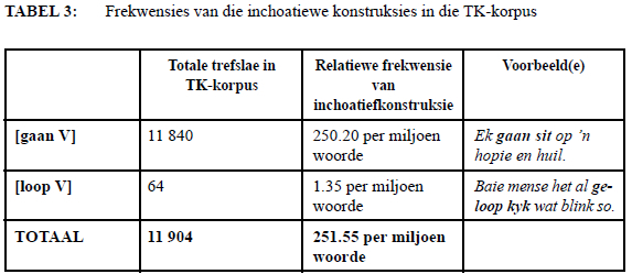 Tabel 2, 3 en 4 bevat die resultate van die konkordansies vir gaan en loop as direkteskakelwerk-woorde in inchoatiewe konstruksies in die drie korpusse.