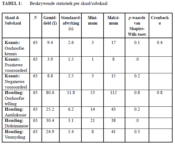 Soos aangedui in Tabel 1, het die respondente redelik swak gevaar in hul oorhoofse kennis van veroudering soos bepaal met die FAQ1, met 'n gemiddelde punt van 9.4 uit 25 (s=2.6). Dit beteken die respondente het 'n gemiddeld van 37.6 persent behaal. Die laagste meting was 3 en die hoogste 17. Die gemiddelde persentasie vir kennis met betrekking tot die biologiese faktore van veroudering is bereken op 48.5 persent. Kennis oor geestelike (41.6%) en maatskaplike faktore (31.2%) was swakker. Ten opsigte van wanopvattings was die gemiddelde persentasie korrekte antwoorde 38.4 persent. Positiewe vooroordeel het gewissel vanaf 1 tot 8, met 'n gemiddeld van 3.9 (s=1.5). Daar is dus min positiewe vooroordeel teenoor ouer persone gemeet. Negatiewe vooroordeel het gewissel van 3 tot 15, met die gemiddeld 8.8 (s=2.5) - dus net onder die middelpunt van die subskaal.