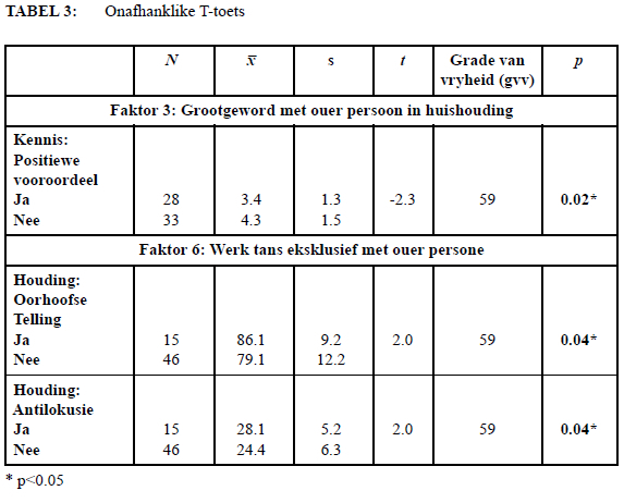 Met betrekking tot "Grootgeword met ouer persone in die huishouding" (sien Tabel 3) is bevind dat respondente wat nie met 'n ouer persoon in die huishouding grootgeword het nie (x=4.3; s=1.5), eerder 'n positiewe vooroordeel teenoor ouer persone openbaar as diegene wat wel met ouer persone grootgeword het (x=3.4; s=1.3), t(59)=-2.3, p=0.02.