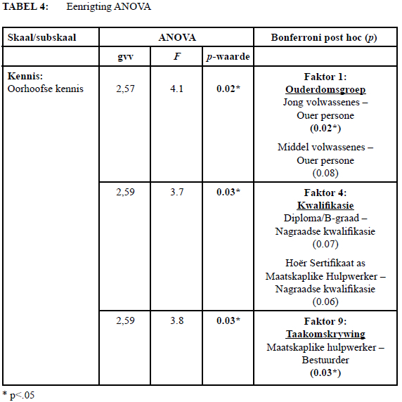 Soos in Tabel 2 uiteengesit, het drie faktore 'n beduidende impak op die respondente se oorhoofse kennis van veroudering gehad: "Ouderdomsgroep" (p=0.02), "Kwalifikasie" (p=0.03) en "Taakomskrywing" (p=0.03). Voorts het "Grootgeword met ouer persoon in die huishouding" 'n beduidende impak gehad op die subskaal "positiewe vooroordeel" (p=0.02). Daarbenewens het "Werk tans eksklusief met ouer persone" 'n beduidende impak gehad op beide die oorhoofse houding (p=0.04) en antilokusie (p=0.04) van die respondente.