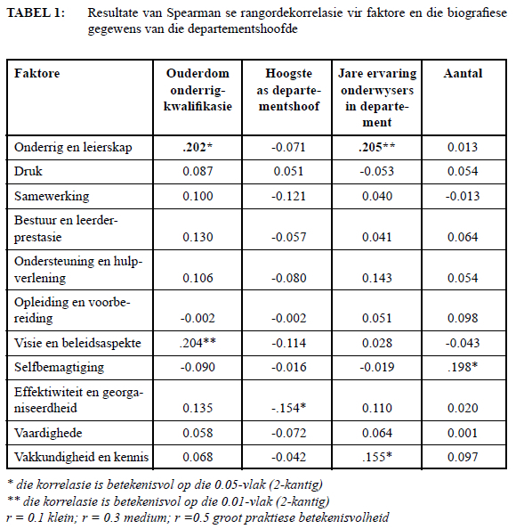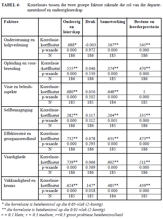 Die hoe korrelasie (0.511) dui aan dat departementshoofde vir wie vaardighede belangrik is, ook hoë waarde heg aan bestuur en leerderprestasie.