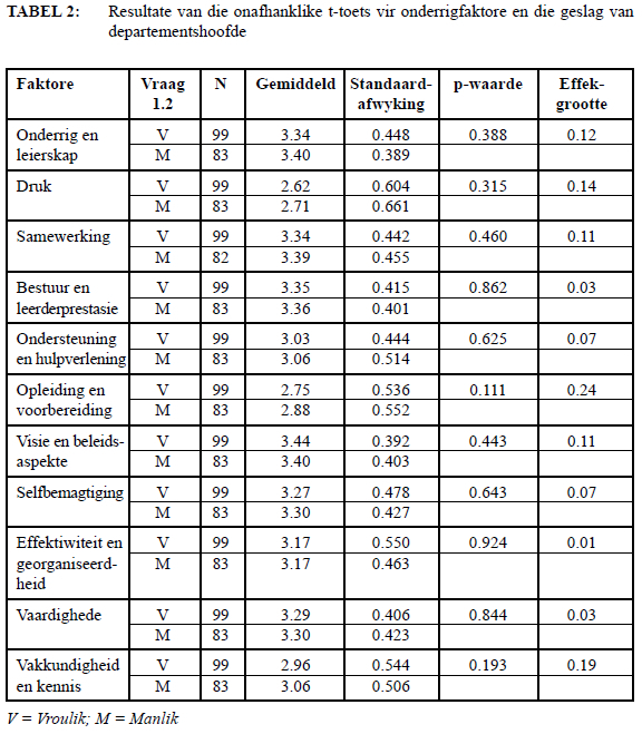 Daar was geen statisties betekenisvolle verskil tussen die deelnemende mans en vroue ten opsigte van hulle siening van die verskillende onderrigfaktore nie. Meer as die helfte van die departementshoofde het oor 'n minimum van vier jaar ervaring as departementshoof beskik. Daar was onsekerheid en 'n gebrek aan opleiding by departementshoofde. Hulle het gemeen dat hulle oor die nodige kennis en vaardighede beskik om alle onderrigleierskapstake en -funksies in hulle departemente te vervul, maar het nie bestuursopleiding ontvang met betrekking tot spesifieke onderrigleierskap, kennis en -vaardighede wat nodig is om effektiewe onderwysers te ondersteun nie. Voorafgaande dui daarop dat die voorbereiding van departe-mentshoofde om hulle pligte uit te voer, feitlik afwesig is. Die kardinale rol van voorbereiding word dus genegeer deur sowel onderwysdepartemente as werkgewers as bestuurders in skole.