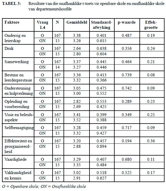 Oor die algemeen korreleer al die faktore positief, maar druk as faktor beïnvloed nie die ander faktore nie. Dit kan impliseer dat as druk op departementshoofde geplaas word, hulle nie noodwendig beter sal presteer met betrekking tot die ander aspekte naamlik ondersteuning en hulpverlening, opleiding en voorbereiding, visie en beleidsaspekte, selfbemagtiging, vaardighede asook vakkundigheid en kennis nie.