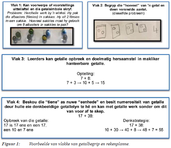 Verdere ondersoek na vroeë wiskundeonderrig waar konteks en probleemoplossing sentraal staan, het gelei tot die probleemgesentreerde benadering soos nagevors deur Murray, Olivier en Human (1998:170). Die kontekste waarna daar verwys word, is egter nie gespesifiseer as lewenseg nie, maar eerder as realisties en verbeelbaar. Murray et al. (1998:169) se benadering tot vroeë wiskundige ontwikkeling dui op 'n sosiokonstruktivistiese proses. Hulle redeneer dat getalbegrip en rekenplanne (bewerkings) ontwikkel wanneer leerders oor sinvolle realistiese probleme nadink en met klasmaats en die onderwyser gesels. Die gesprek ondersteun leerders om getalle op logiese maniere te ontleed en krities na te dink oor rekenplanne en resultate. Getalbegrip is meer omvattend as abstrakte telvaardigheid en sluit ook die volgende in: begrip van die grootte en waarde van hoeveelhede, en die sin van getalsimbole; die vermoë om verwantskappe tussen getalle te vestig en die vermoë om getalprobleme sinvol op te los en te oordeel of antwoorde sin maak. Wanneer leerders probleme oplos, kan hulle op toenemende vlakke van getalbegrip werk (Murray & Oliver, 1989:5). Figuur 1 illustreer vlakke van getalbegrip en rekenplanne wat VEG-leerders in hierdie studie gebruik het.
