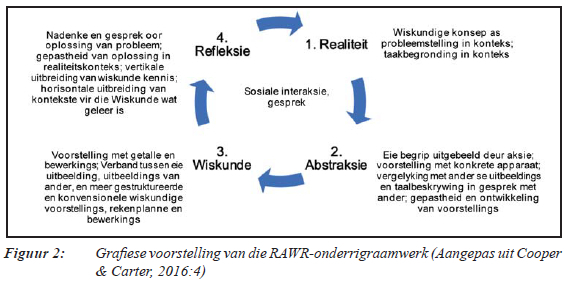 Die Realiteit, Abstraksie, Wiskunde en Refleksie (RAWR)-raamwerk (Cooper & Carter, 2016:177) beskryf 'n onderrigverloop vir 'n praktiese aanslag tot wiskundeonderrig wat in kontekste geanker bly. Die RAWR-onderrigraamwerk skep 'n pedagogiese vloei vanaf indompeling in realiteit, na abstraksie, wiskundige voorstelling, en nadenke (refleksie), soos voorgestel in Figuur 2.