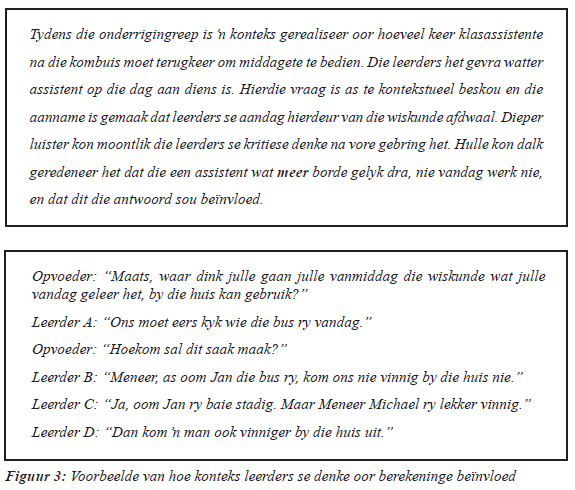 Die onderrigstrategie van gesamentlike konteksrealisering was dus 'n didaktiese besluit wat geneem is as 'n manier om die wiskunde-ervarings in die onderrigingreep so ná as moontlik aan leerders se geleefde ervarings te bring en dan die wiskunde daarop te bou.