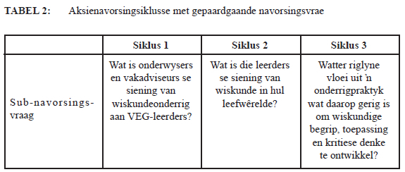 Die volgende oorkoepelende vraag het die navorsing gerig: Watter riglyne vir onderwysers kan ontwikkel word uit 'n wiskundeonderrigpraktyk wat die ontwikkeling van wiskundige begrip van VEG-leerders vanuit lewensegte kontekste aanpak? Aksienavorsing (Rossouw, 2009:1) is as navorsingsontwerp gekies aangesien dit 'n proses verskaf waardeur onderwysers hulle onderrigpraktyke reflektief kan verbeter. Drie subvrae is gestel wat elkeen in 'n siklus van die aksienavorsing aangespreek is. Tabel 2 dui die drie aksienavorsingsiklusse aan volgens drie subnavorsingsvrae.