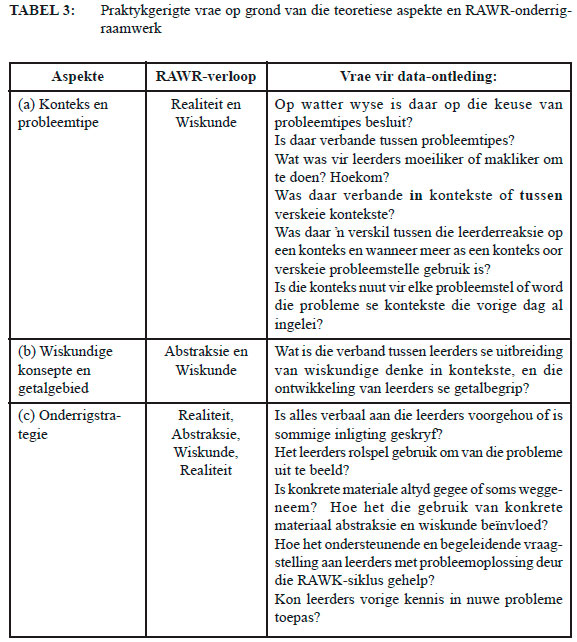 Onderrigbesluite is op grond van praktykgerigte vrae oor vier teoretiese aspekte geanaliseer: die wiskundige probleemtipe, die konteks, die onderrigstrategie en die gekose getalgebied. Die RAWR-onderrigraamwerk is gebruik om stelselmatig na te dink oor leerders se wiskundige denke in elke stadium van die onderrigverloop met die gebruik van kontekste en probleme. Tabel 3 gee 'n kriptiese oorsig oor die wyse waarop die bogenoemde aspekte gebruik is om die ontleding van die onderrigbesluite te doen: