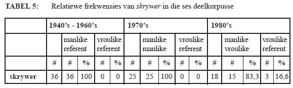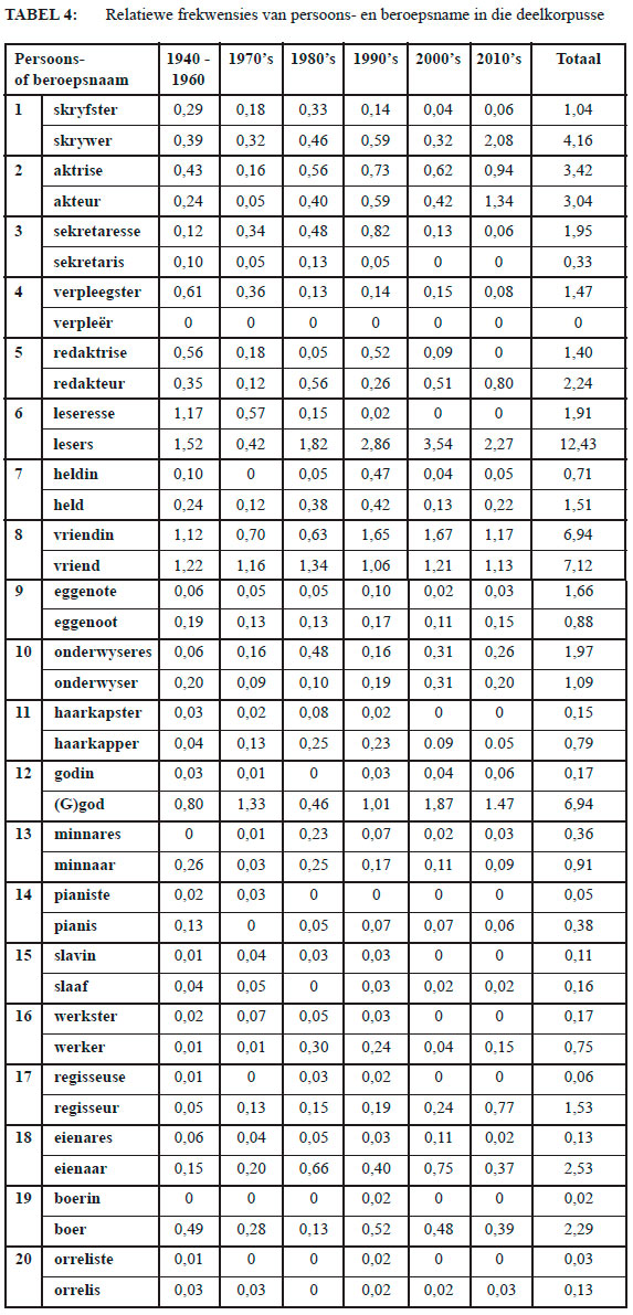 Een van Beyleveld en Van Jaarsveld se gevolgtrekkings is dan ook dat daar - wat die beroepswereld spesifiek betref - "'n definitiewe neiging is om (+MANLiK)-vorme te gebruik om sowel die man as die vrou te benoem" (Beyleveld & Van Jaarsveld, 1991: 12). Hulle bevind voorts dat daar oorweldigend meer van manlike as van vroulike woorde in bogenoemde woordeboeke se voorbeeldsinne gebruik gemaak word.