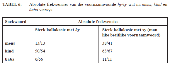 Wat afgelei kan word uit die kollokasies in die korpus, is dat verwysings na baba, kind en mens in die meeste gevalle 'n voorkeur vir die manlike persoonlike of besitlike voornaam-woorde aantoon. Dit mag wees dat hierdie gebruik op 'n behoefte aan 'n neutrale, ongemerkte vorm dui (miskien soortgelyk aan die voorstel dat hulle liefs gebruik moet word wanneer 'n bepaalde gender nie geïdentifiseer kan / wil word nie). Die frekwensie van hy in die korpus toon sekere tekens van taalseksisme in die korpus en dus ook in die samelewing aan.