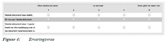 Respondents read one of 18 selected plain language documents and answered questions about the documents. Extratextual information, such as respondents' highest qualification level, annual income, home language, the variety of Afrikaans they speak, and the frequency with which they were exposed to the context, were collected. Engagement with the selected document was measured using Likert-scale statements. To assess understanding of the documents, factual questions were included, and usability questions were asked if respondents received one of the six forms that were tested. Experience with the plain language documents was also measured by means of Likert-scale statements. Importantly, respondents'experiences with specific plain language techniques were assessed, allowing them to express their experience with said techniques.