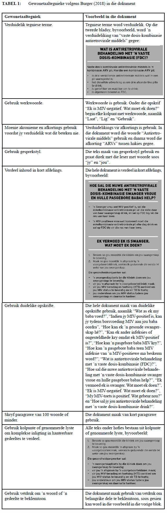 Hierdie dokumente kan dus almal as "gewonetaaldokumente" geklassifiseer word omdat hulle vir die gewonetaaltegnieke in die kontrolelys in Addendum A bestudeer is. Die kontrolelys is saamgestel uit gewonetaaltegnieke wat geïdentifiseer is deur Gouws (2010), Harris, Kleimann en Mowat (2010), Kimble (2002), Petelin (2010), Fine (2001), DuBay (2008), Cornelius (2010a, 2012, 2020), Siebörger en Adendorff (2011) en Cheek (2010) en vervat in my magisterverhandeling (Burger, 2018). In hierdie studie het ek na die iteratiewe aard van die suksesvolle toepassing van gewonetaaltegnieke gekyk. Ek het die kontrolelys saamgestel om die toepassing van gewonetaaltegnieke in my M-studie meer gestandaardiseerd te maak. In die res van hierdie artikel wanneer daar na "gewonetaaltegnieke" verwys word, word daar verwys na die gewonetaaltegnieke wat in Burger (2018) uiteengesit is en in Addendum A verkry kan word.