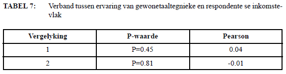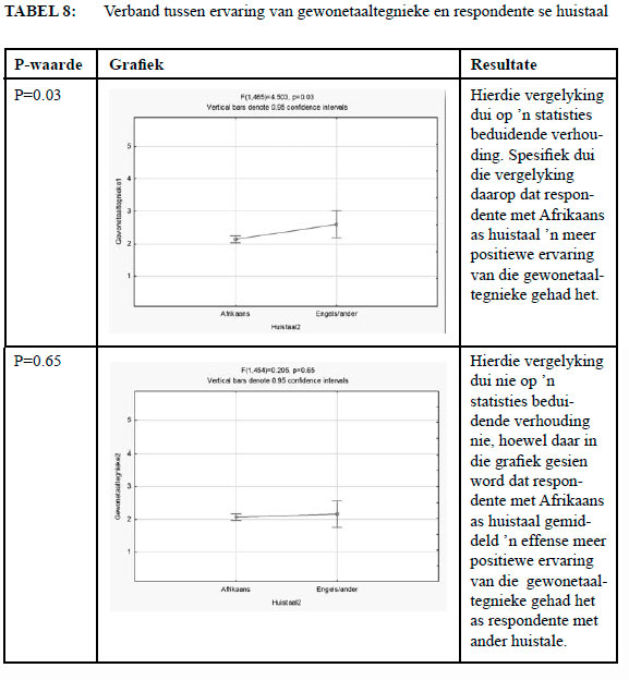 When considering extratextual factors, few statistically significant relationships were found. Only the respondents' home language showed a significant relationship with their experience of plain language techniques, suggesting that Afrikaans speakers had more positive experiences. For other extratextual factors, namely qualification, income level, and variety of Afrikaans, there were no significant correlations.