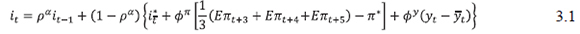 Die nominale repokoers it is 'n funksie van die vorige repokoers it-1, die neutrale nominale rentekoers it-, die verwagte inflasiegaping -