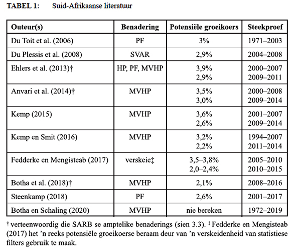Benewens die internasionale literatuur bestaan daar 'n omvattende Suid-Afrikaanse korpus van akademiese literatuur (opgesom in Tabel 1) oor die beraming van die plaaslike produksiegaping en potensiële ekonomiese groei. Alhoewel die PF-benadering in die vroeëre jare gewild was, het latere studies (sedert 2014) bykans uitsluitlik op die MVHP-raamwerk staatgemaak. In vergelykbare steekproewe het die PF-benadering dikwels hoër beramings van potensiële produksie opgelewer (sien ook Klein, 2011), wat moontlik daaraan toegeskryf kan word dat dit 'n probleem is om 'n akkurate, stabiele maatstaf vir die NAIRU in Suid-Afrika te bepaal (Du Toit, Ground & Van Eyden, 2006).