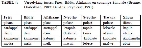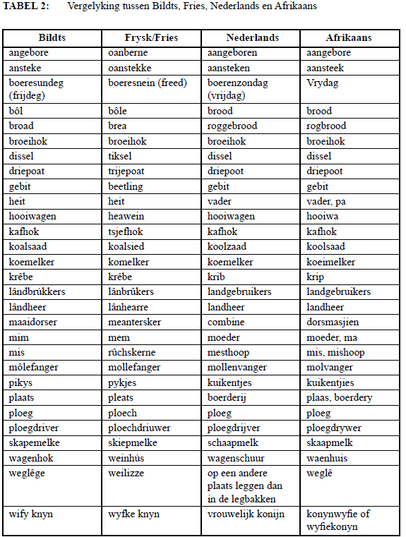 Enkele terme uit die taalgroepering Fries, Bildts, Nederduits en Nederlands word met Afrikaanse terme vergelyk. 'n Vergelykende studie is voorts gedoen oor veral Bildts, Afrikaans en die amptelike Sintutale in Suid-Afrika ten opsigte van sake soos taalontwikkeling en -erkenning, standaardisering, en leksikografie- en terminologieontwikkeling. Die artikel bevat verskeie tabelle met terme uit die landbou wat ooreenkomste en/of verskille in die betrokke tale toon.