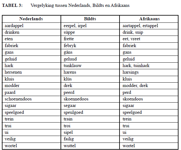 A comparison between related languages, including Bildts and Afrikaans