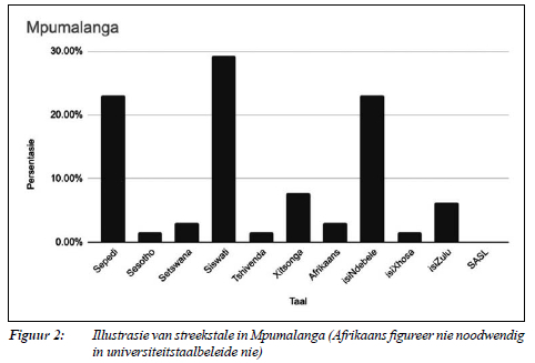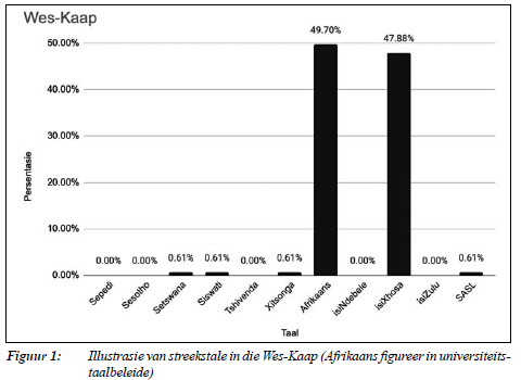 Taalbeleide is soos reeds aangedui, belyn met streekstale. Engels uitgesluit, volg hier twee voorbeelde ter illustrasie - een uit 'n provinsie waar Afrikaans 'n dominante taal is (kyk Figuur 1) en een uit 'n provinsie waar Afrikaans 'n minder dominante taal is (kyk Figuur 2). Universiteite wat geleë is in provinsies waar Afrikaans sterker figureer, sluit dit dan tipies by hul taalbeleide in. So byvoorbeeld, sal universiteite in die Wes-Kaap wel Afrikaans in hul taalbeleid insluit, terwyl universiteite in provinsies soos Mpumalanga dit nie sal doen nie.