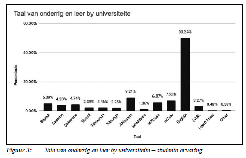 Die studentevraelyste het kommerwekkende data na vore gebring, naamlik dat Engels, soos ook verwag, die de fcto-taal is vir onderrig en leer (vergelyk Figuur 3), ten spyte van die huistaalverspreiding, streekstale en tale wat de jure by universiteitstaalbeleide ingesluit is.