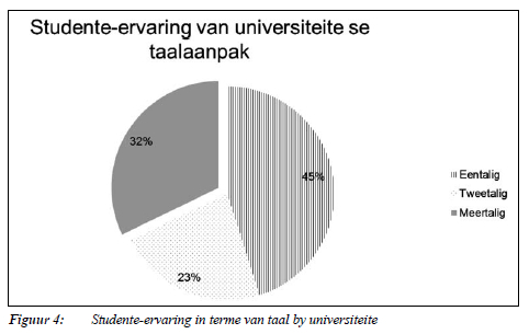 Wat meertaligheid betref, het die meerderheid studente aangedui dat hulle die betrokke instelling as eentalig ervaar (kyk Figuur 4).