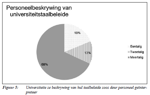Teenoor die inligting in Figuur 4, het personeel aangedui dat hul instellings hulself amptelik as synde meertalig identifiseer (kyk Figuur 5). Dit bevestig weer dat universiteite tipies die regte geluide maak en voldoen aan eise van byvoorbeeld die DHOO, maar in praktyk speel 'n ander scenario uit.