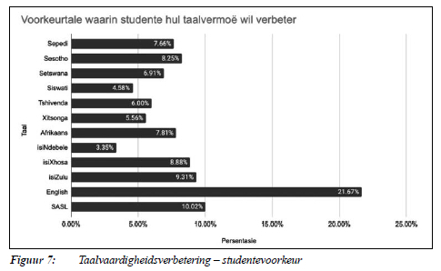 Wat die verbetering van algemene taalvaardigheid betref, het 'n verstommende 95,7% van die studente-respondente aangedui dat hulle beslis hul vermoë in 'n ander taal wil verbeter. Uit 'n vraag oor die tale waarin hul wel hul algemene taalvaardigheid wil verbeter, blyk die volgende: