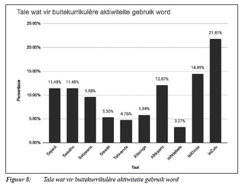 Die tale wat volgens studente wel gebruik word, word in Figuur 8 voorgestel. Hierdie data is vergelykbaar met, of bevestig, ander datastelle, naamlik dat by universiteite waar hoofsaaklik studente uit bepaalde taalgemeenskappe geakkommodeer word, daardie tale ook op informele wyse deel van die studentegemeenskap se daaglikse handel en wandel word.