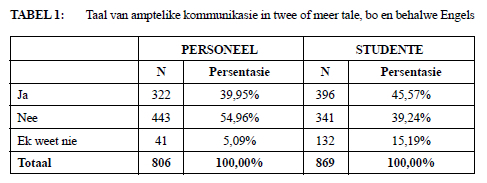 Soos uit Tabel 1 blyk, kommunikeer universiteite in die meerderheid van die gevalle nie in meer as twee amptelike tale benewens Engels nie. Uit verdere kwantitatiewe data, wat ook bevestig is deur die gestruktureerde onderhoude, blyk dit dat Afrikaans, Sesotho en isiZulu die drie grootste tale is wat benewens Engels vir kommunikasie, administrasie, kentekens en bemarking gebruik word. Hieruit kan afgelei word dat universiteite steeds te kort skiet wat 'n inklusiewe, verwelkomende en meertalige omgewing betref.