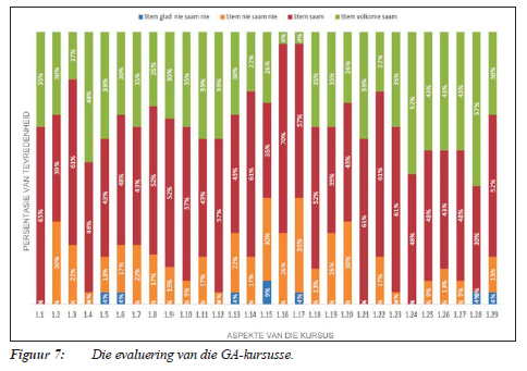 The evaluation questionnaire determined the extent to which the GA courses met the needs of the students. More specifically, it evaluated the content used on the online platform to determine to what extent this met the expectations of the enrolled students. The interviews, (long after their individual and final course results were known) with respondents who had previously completed the course were used to cross-check responses gathered in the first needs analysis questionnaire before course enrolment.