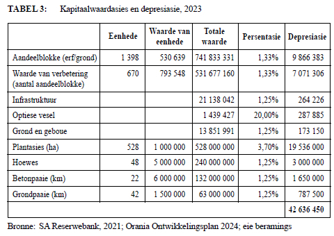 Die beraamde waarde van kapitaalbates en beraamde depresiasie van hierdie bates vir 2023 word in Tabel 3 getoon. Depresiasie op hierdie kapitaalbates vir 2023 is beraam op Φ42 636 450 (Φ42,6 miljoen). Orania se BGP vir 2023 word dus op Φ462,0 miljoen beraam.