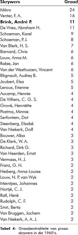 Die volgende tabel verskaf die graadsentraliteite van die aktiefste prosaskrywers van dié dekade. Slegs skrywers met 'n graadsentraliteit van twee en meer word aangedui (sien tabel 4).