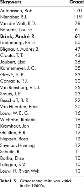 Dit beteken dat André P. Brink die derde mees produktiewe skrywer van die dekade was, met in agneming van die drama, poësie én prosa, terwyl Mikro en F. A. Venter die produktiefste was. Produktiwiteit is natuurlik nie 'n aanduiding van 'kwaliteit' (hoe dit ook al gemeet word) nie, en ook nie van invloed nie, en dus moet daar deurgaans gewaak word teen kwalitatiewe interpretasies van graadsentraliteit.