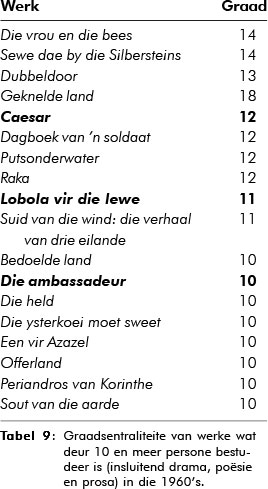 'n Belangrike verdere toepassing van graadsentraliteit is om te bepaal oor watter werke die meeste persone skryf, aangesien dit natuurlik 'n aanduiding is van die werke wat die wydste aandag van kritici, letterkundiges en literatuurhistorici ontvang het. Tabel 9 verskaf die graadsentraliteite van werke wat deur 10 en meer persone bestudeer is (insluitend die drama, poësie en prosa).