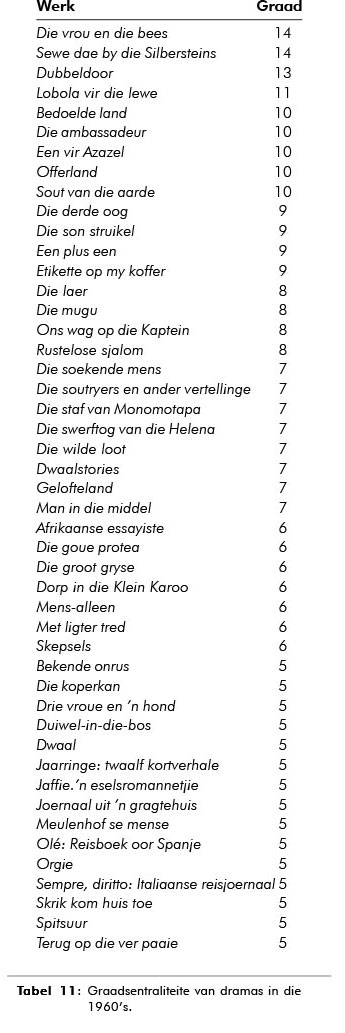 In tabel 10 is die graadsentraliteite van dramas weergegee (5 en meer).