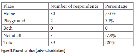 The pace of narration is something else worth mentioning because the home- which ought to be vital in imbibing society's cultural values and norms to the children in my opinion-and school respectively are among the agents of socialisation of a child. In this table, 33.3% of respondents (less than half) selected the home while the school received a 0% response. Likewise, the combination of both home and school recorded 0% and "Not at all" recorded 66.7%, which is the highest percentage. The schools in Gombe do not see the importance of including any of the aforementioned cultures in their curriculum because they see it as something that is out of place and less important in the child's development. Instead, they introduced the watching of cartoons and nursery rhymes that do not portray the cultural practices of the children's immediate environment. It is of utmost importance to consider the social context of the children when drawing up the school curriculum because the oral folktales and play-songs are part and parcel of the social settings in which these children live. As a result of development, the parents and their children start to interact with other people and institutions that influence their perspective in life, where they learn and incorporate the cultural practices of the other participant. In essence, the combination of the oral folktales and play-songs infused with cartoons and nursery rhymes bring about hybridisation which is vital in the development of the child in this modern world.