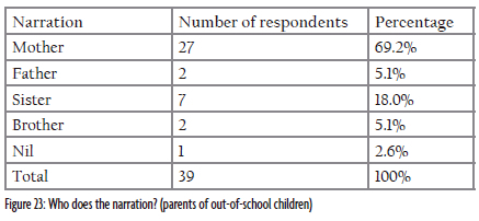 In terms of awareness, 92.3% of out-of-school children and their parents indicated that they are aware of folktales and play-songs and 7.7% indicated that they are not. The frequency of narration figures indicated 41.0% regular narration, 43.6% irregular narration, and a 15.4% response to the 'not at all' option. These percentages suggest that both parents and their out-of-school children are aware of folktales and play-songs and do pay regular attention because the slight difference between regular and irregular narration is just 2.6%. In essence, the percentage shows that the out-of-school children and their parents are putting into practice the narration of folktales and play-songs which suggests that the parents of out-of-school children are advocates of Hausa folktales and playsongs because it is manifest in their responses and those of their children respectively. Nevertheless, the out-of-school parents and their children are not helping the situation because we live in a dynamic and digital world where mass media plays a vital role in our everyday life. Focussing only on the oral aspect of the preservation, sustainability, and continuity of these (folktales and play-songs) oral genres may serve as a threat to the past, present, and future children of Gombe State because such practices do not consider preserving the folktales and play-songs via documentation for immediate and future reference.