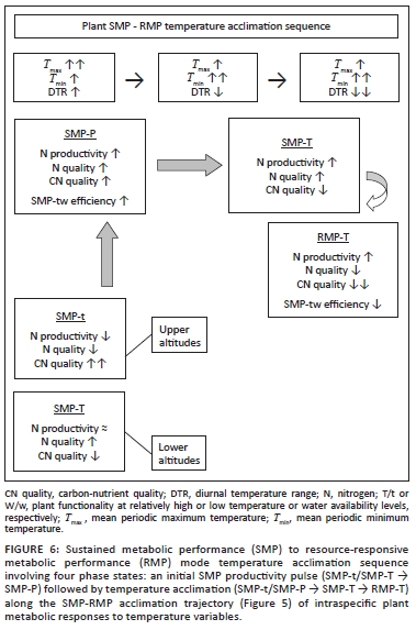 In the climate-vegetation response model the expression of relative RMP to SMP functionality results from, inter alia, the acclimation to changing temperature conditions. In response to increasing Tmax (daytime temperatures), the productivity of tropical and subtropical forage plants (especially C4 grasses) is increased (Long 1999; Luo 2007; Wan et al. 2005), resulting in greater quantities of plant protein in the landscape (increased nitrogen productivity). Tmax was found to be positively correlated with Tmin (r = 0.52, n = 30, p < 0.004) and negatively correlated with the amounts of summer rainfall (r = 0.54, n = 30, p < 0.003). Phases of relatively elevated Tmax therefore indicate conditions of increased solar radiation (reduced cloud cover) and reduced water availability for plant growth (reduced rainfall). The associated increased photosynthesis-to-growth ratio is conducive to enhanced forage quality (increased storage allocation; reduced nitrogen dilution). During the initial phases of increasing temperature, Tmax is relatively high compared with Tmin and relatively high diurnal temperature ranges are thus encountered, supporting a pulse of enhanced SMP productivity (increased Tmax / Tmin ratio, increased Tmax- Tmin differential, and increased ratio of photosynthesis to respiration). This forms the basis of the first of four defined temperature acclimation phase states (SMP-P, phase of increased SMP productivity) constituting the temperature acclimation sequence resulting from (pulses of) increasing atmospheric temperature (Figure 6). However, as the Tmax / Tmin differential (diurnal temperature range; DTR) declines as nocturnal warming ( Tmin ) increases faster than daytime temperatures, SMP-to-RMP mode acclimation occurs (decreased Tmax / Tmin . ratio, decreased Tmax - Tmin . differential, and increased ratio of respiration to photosynthesis) and sequential temperature acclimation phase states come into effect (Figure 6). The initially enhanced SMP mode productivity declines and RMP-mode growth increases [referred to as over-compensation by Wan et al. (2009)]. The associated shift from SMP-tW/Tw to RMP-TW functionality has physiological consequences which compromise forage quality (Figure 5), notably owing to a shift from storage-based to relative growth-dominated metabolism. This results in a reduction of stored metabolites (TNC, minerals and protein) relative to the accumulation of structural carbon through accelerated growth (reduced carbon-nutrient quality; Figure 5). Furthermore, RMP-TW mode functionality implies metabolic growth activity at higher water and temperature optima. Growth realisation thus takes place under conditions of concurrently high temperature and water availability (TW conditions; at high water and temperature optima), constraining plant productivity under conditions when growth-curbed physiological activity (based on SMP-tw functional efficiency) associated with the production of highquality forage (early morning hours, early in season, dry season growth: SMP-tw functionality) could have occurred. Dry-season rainfall supports SMP-tw functionality, thus promoting the production of forage items of high carbonnutrient and nitrogen quality (Figure 5). However, with progressive SMP-to-RMP acclimation SMP-tw efficiency is expected to decline as RMP-TW functionality favours growth under conditions of higher temperature and water availability. SMP-to-RMP temperature acclimation (shifts from SMP-tW/Tw/tw to RMP-TW functionality) is therefore expected to result in forage with lower nitrogen quality (Figure 5: nitrogen dilution and lowered dry-season forage digestibility) and notably lower carbon-nutrient quality (Figure 5: low metabolic storage allocation priority).